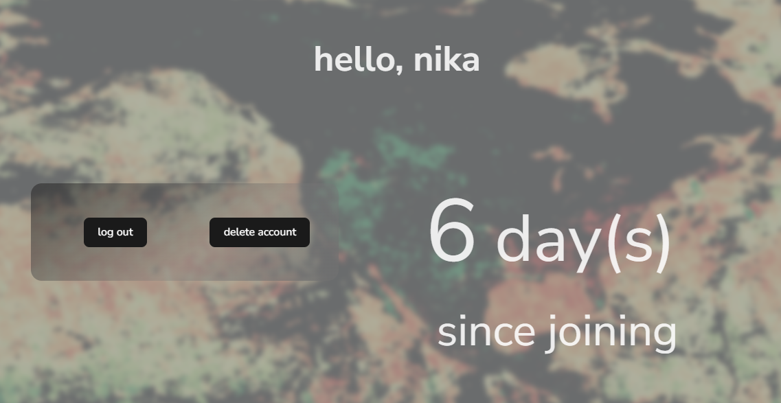 ProfilePage tracks days dince joining and allows to log out and delete account.